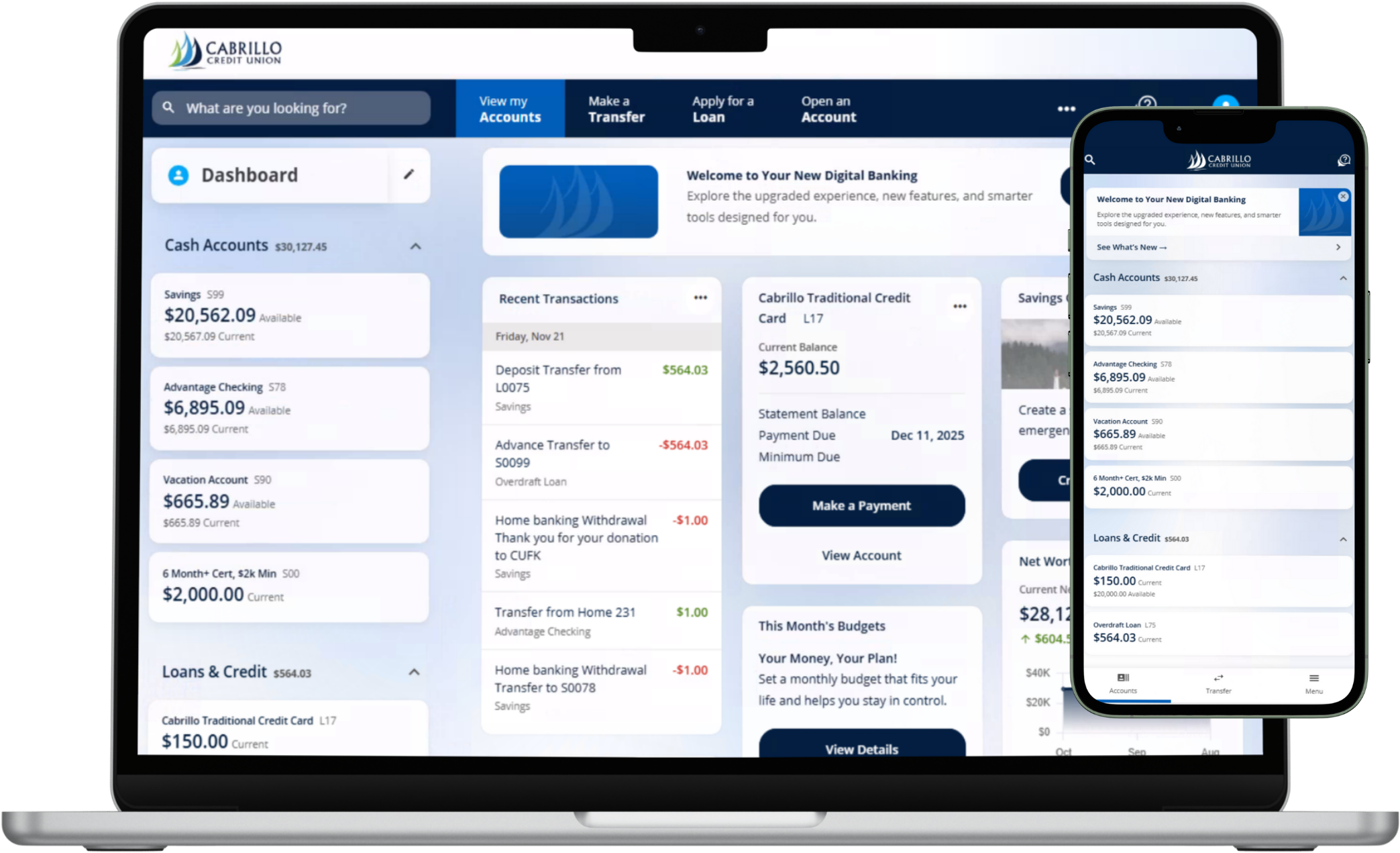 Your new dashboard puts what matters most front and center. See your balances, recent transactions, upcoming payments, and key tools in one simple view.