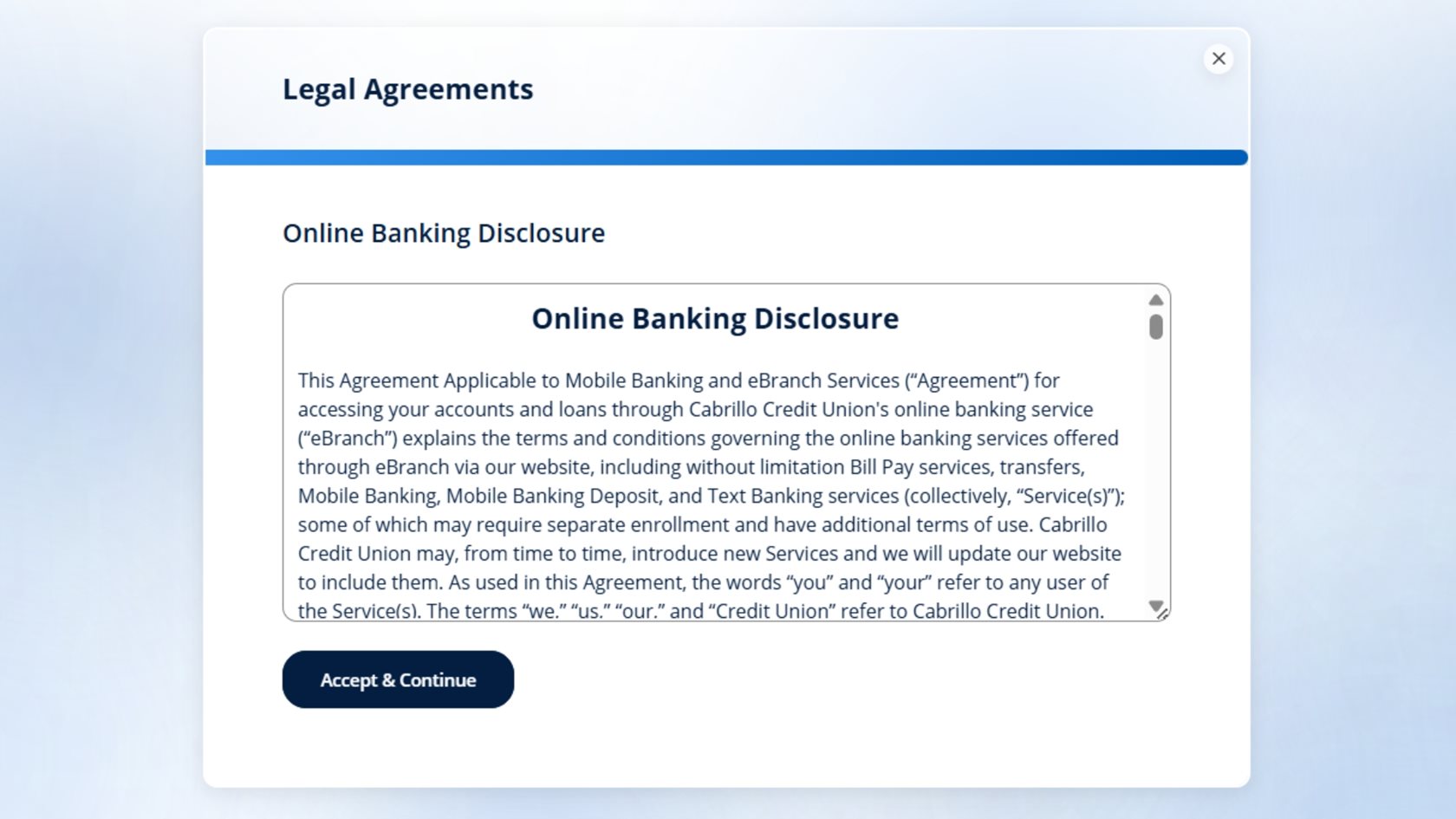 Review the Online Banking Disclosure. When you’re ready, select Accept & Continue to move on.