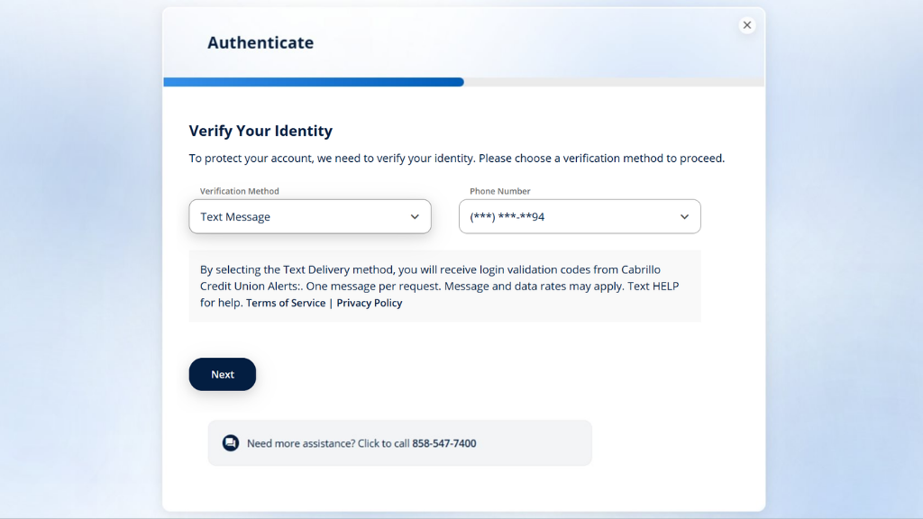 On a computer, visit CabrilloCU.com and login as you normally would with your user name and password. Click Secure Login and you'll be taken to the getting started login screen where you'll verify your personal info.