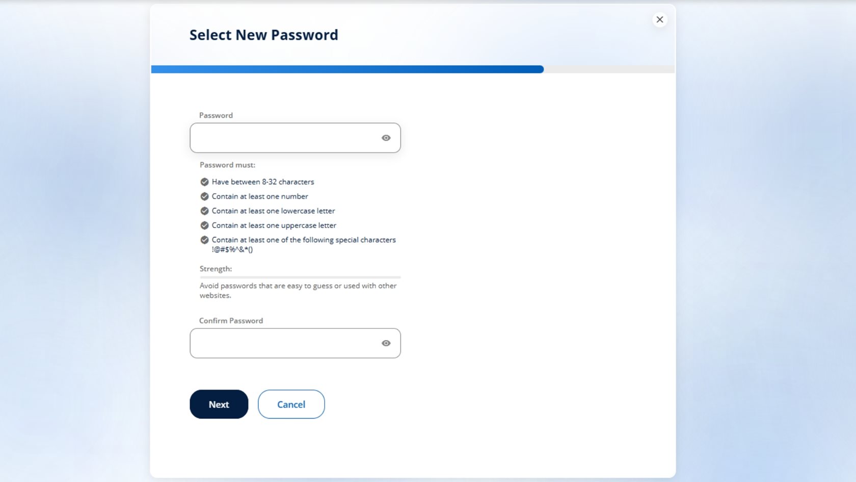 Once you confirm your verification code, select and confirm your new password and tap Next. These will be the credentials you use to access Digital Banking going forward.